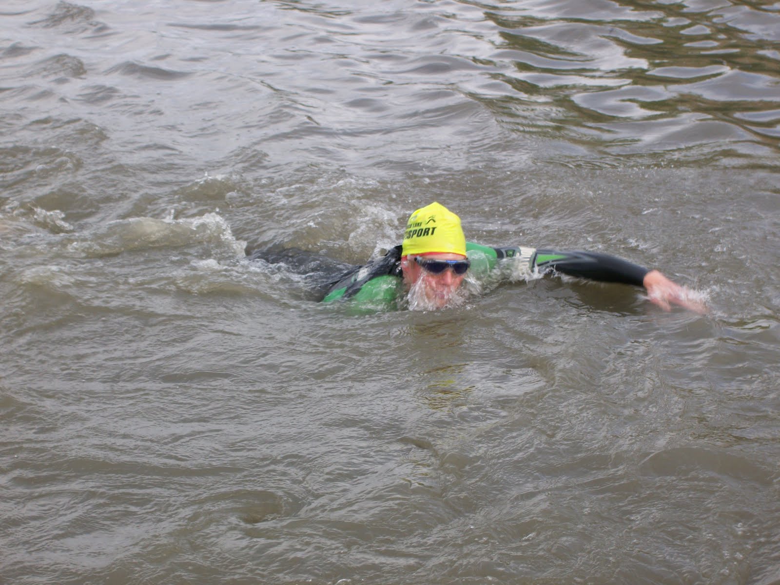 The swim start was crowded and murky. Some person, who obviously lacks a master’s degree, thought it would be a great idea to have the swim start and finish at the exact same location. This is fine except that this was a three-wave, quarter mile swim. The leaders, from the previous wave, were on top of the awaiting swimmers within minutes.